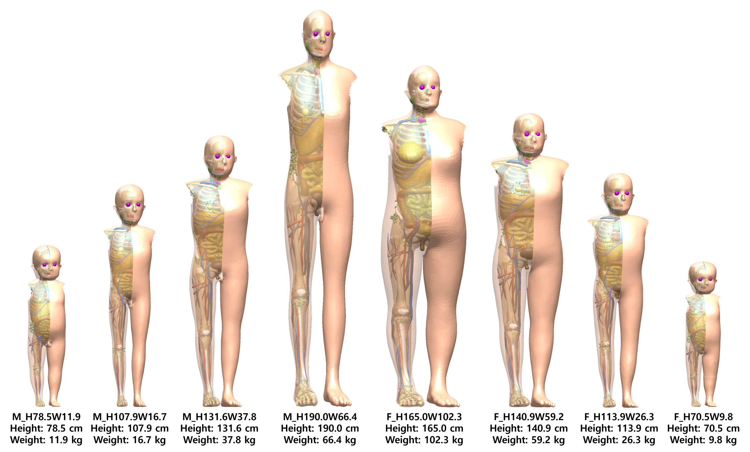 Reference: Kim, S., Shin, B., Choi, C., et al. (2024). Pediatric phantom library constructed from ICRP mesh-type reference computational phantoms (MRCPs). Nuclear Engineering and Technology56(8), 3210-3223.
